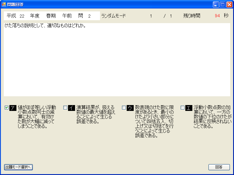 ア、イ、ウ、エのどれかのチェックボックスをオンにし、回答ボタンをクリックします。